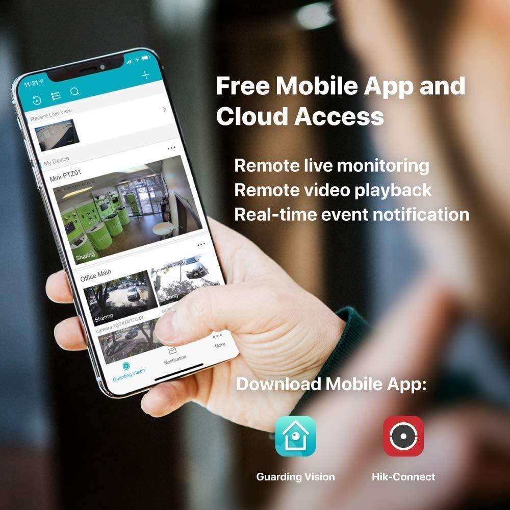 【FREE MOBILE APP WITH CLOUD】The system provides free mobile App for both Android and iOS which allow users to remote live view and remote playback videos from tens of different locations. It supports motion detection and notify events by email or Mobile App. User can also easily share cameras with controlled access privileges. The mobile APP name is Hik-Connect or Guarding Vision, which is proved to be one of the most friendly and reliable App in this industry.