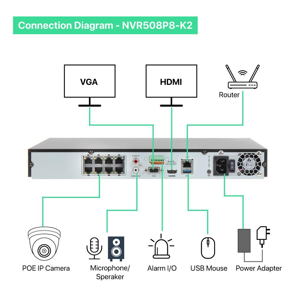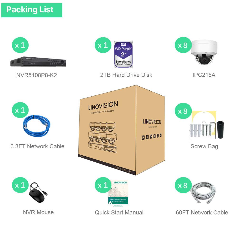 8 Channel 4K NVR PoE IP Camera System H.265+ 8 Channel 4K NVR with 2TB HDD and 8 Outdoor 5MP PoE Dome Security Cameras