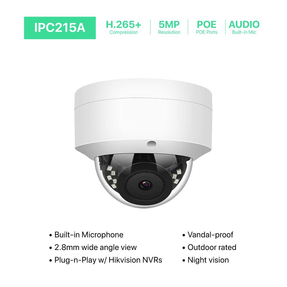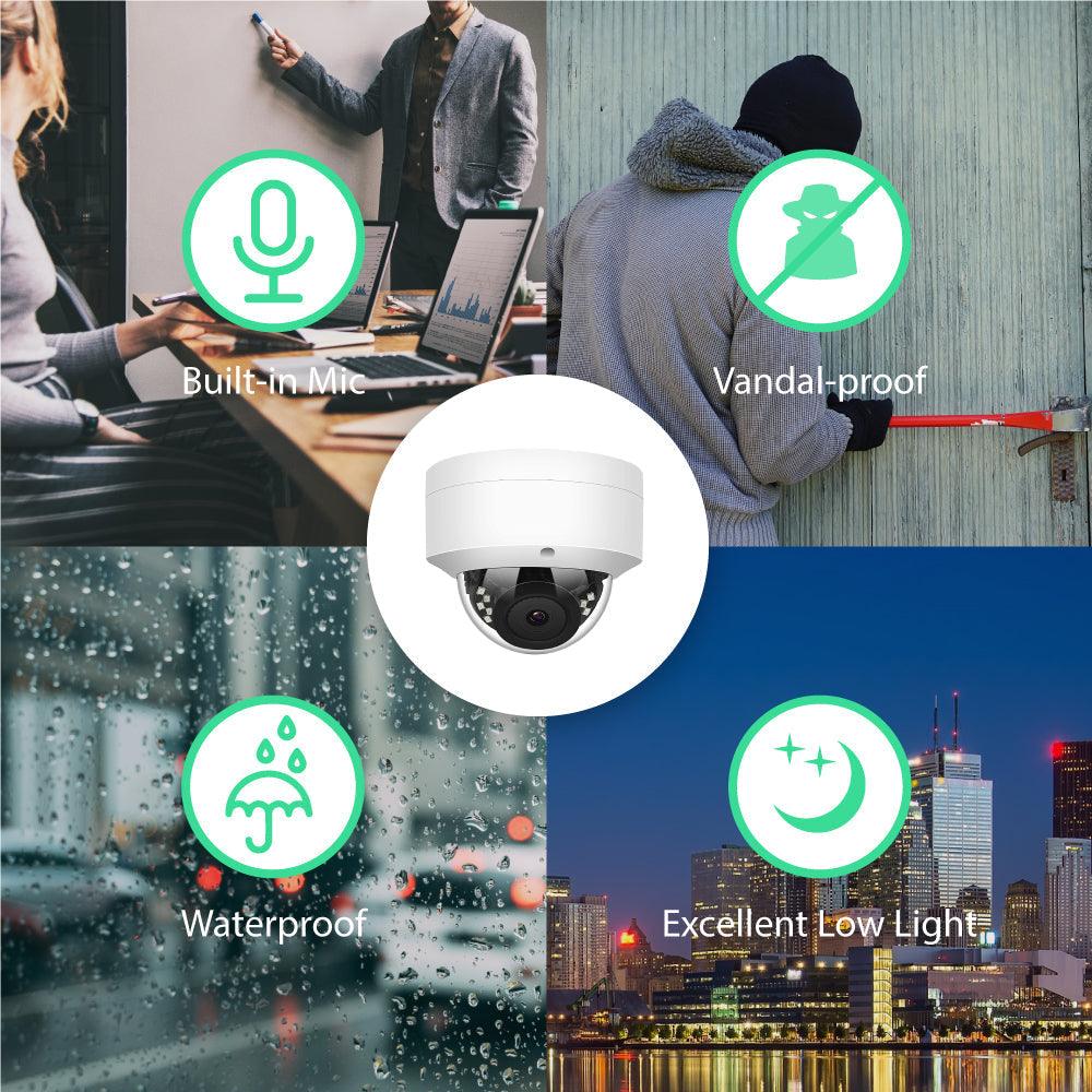 【5MP POE IP CAMERA WITH AUDIO】This vandal-proof dome POE IP Camera features with Sony IMX335 low light CMOS sensor output 5 Megapixels (2592x1944) superior image quality and built-in microphone. It supports the advanced H.265 video compression which saves up to 70% storage space. 18 SMD IR LEDs for night view, distance up to 100ft. High quality mental housing enables both indoor and outdoor use for home and commercial surveillance security system with quick and easy installation.